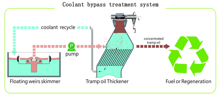 This system is continuously online skimming, separation, concentration, etc. The tramp oil that coalesces largest amount insoluble contaminants is discharged from the emulsion system in the form of concentrated tramp oil . This type of bypass treatment achieves the goal of no downtime maintenance. The amount of bypass treatment is very few compared to the emulsion working cycle. It does not affect the matching of the original system pump, and minimizing heat loss.